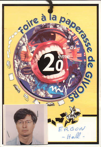 BADGE ENTRÉE PERMANENTE DE LA 20ème FOIRE À LA PAPERASSE - M.J.C. - GIVORS 1998